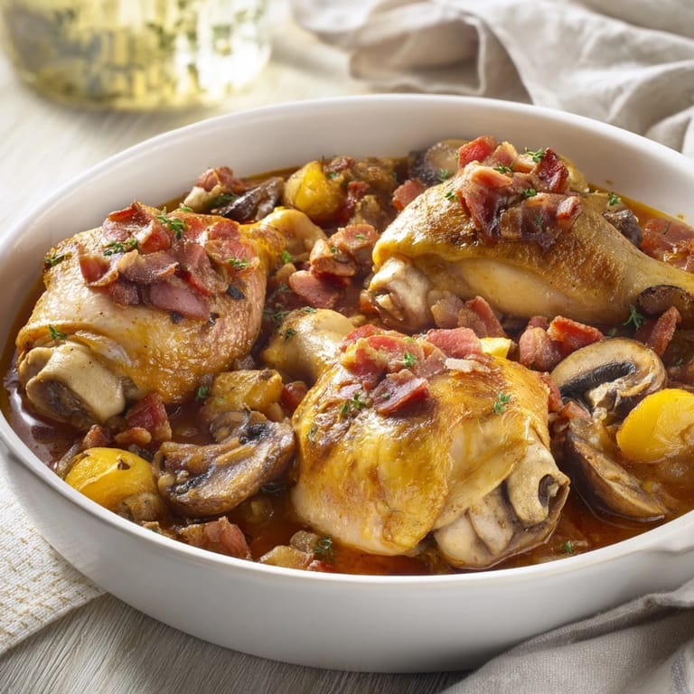 Save A modern, one-pot take on the classic French dish, featuring tender chicken thighs simmered in red wine with mushrooms, bacon, and aromatic vegetables ready in a fraction of the traditional time.