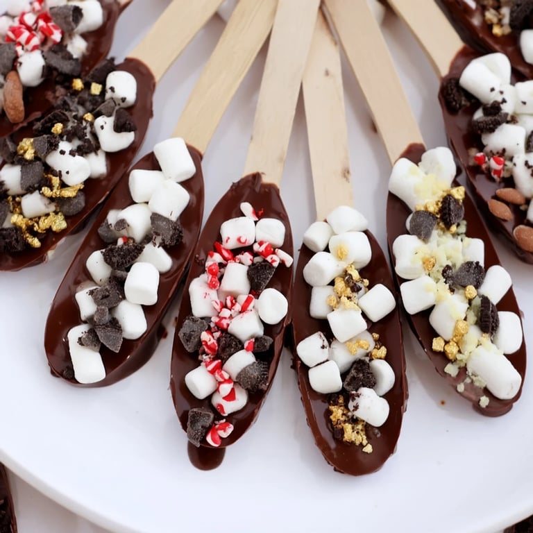 Save A fun and interactive dessert featuring an array of toppings for dipping hot chocolate spoonsβperfect for cozy gatherings or festive occasions.