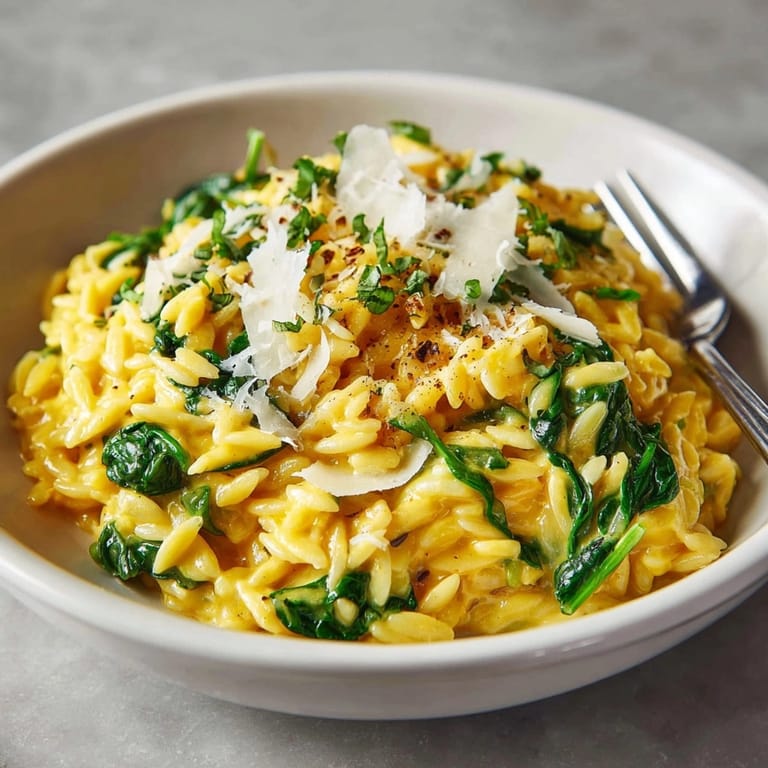 Save This one-pot pumpkin Parmesan orzo transforms simple ingredients into a restaurant-worthy meal in just 35 minutes. The creamy pumpkin sauce coats each grain of orzo perfectly, while wilted spinach adds color and nutrition to this comforting dish that's become my go-to dinner during autumn evenings.