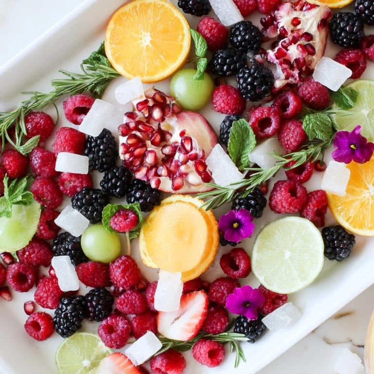 This lively tray brings together a selection of fresh raspberries, blackberries, strawberries, pomegranate arils, citrus slices, grapes, aromatic herbs like mint and rosemary, plus optional edible flowers. Sweet accents include sugar cubes, crystallized ginger, and chocolate shavings, with liqueurs and syrups arranged for easy garnish. Perfectly prepared in 20 minutes, it adds elegance and flavor to your New Years Eve drinks setup, inviting guests to personalize their bubbly experience with visual appeal and delightful aromas.
