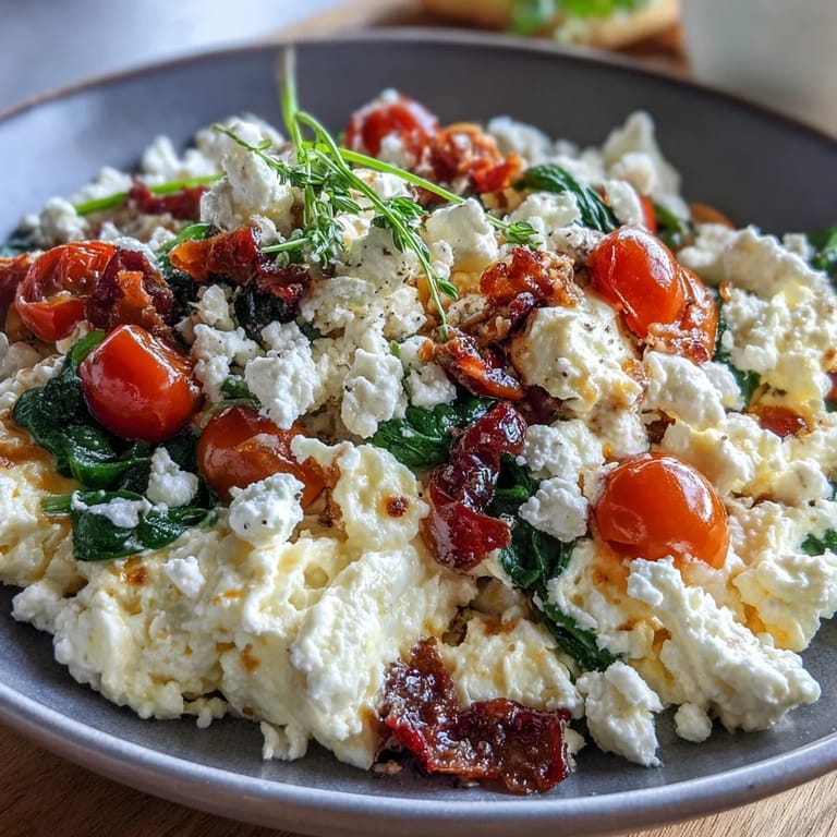 This dish combines fluffy eggs with creamy cottage cheese and a colorful mix of sautéed vegetables such as bell peppers, spinach, onions, and cherry tomatoes. It cooks quickly in about 10 minutes and delivers a protein-rich, flavorful start to the day. Seasoned lightly with salt, pepper, and optional dried herbs, this scramble is perfect for a nutritious breakfast or brunch that satisfies and energizes. Easy to prepare and adaptable with your favorite veggies or spices, it offers both taste and nourishment in a simple skillet meal.
