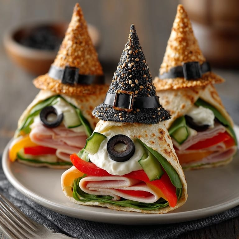 Turn the preparation of these witch hat wraps into a fun Halloween activity by setting up an assembly station. Prepare all ingredients in advance and let children build their own magical creations. Place tortilla triangles, spreadable cream cheese, and all toppings in separate bowls. Guide younger children through the rolling process while allowing them creative freedom with decorations. This hands on approach not only entertains the little ones but also encourages them to try new vegetables when presented in a playful context.