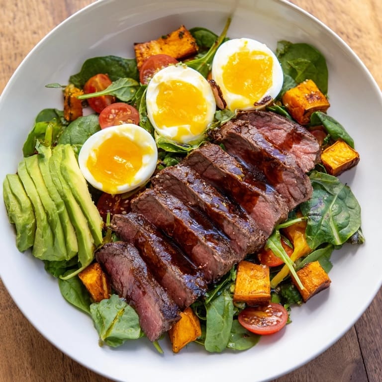 The clock in this recipe is real—45 minutes from start to finish with everything landing on the plate at the same time. Start with the sweet potato roasting, sear the beef while it cooks, boil the eggs when the beef starts, and make the dressing whenever you have two hands free. By the time you've sliced and arranged everything, your sweet potato should be golden, your eggs should be cool enough to peel, and your beef should have rested just enough. It's the kind of timing that feels chaotic until you do it once and realize it actually flows.