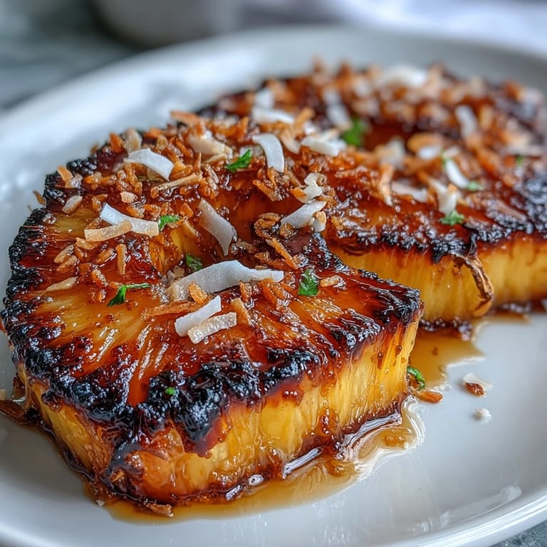 - Arrange the warm roasted pineapple on a serving platter, scatter the toasted coconut over the top, and serve while still warm so the glaze is soft and the coconut is still slightly warm and aromatic.