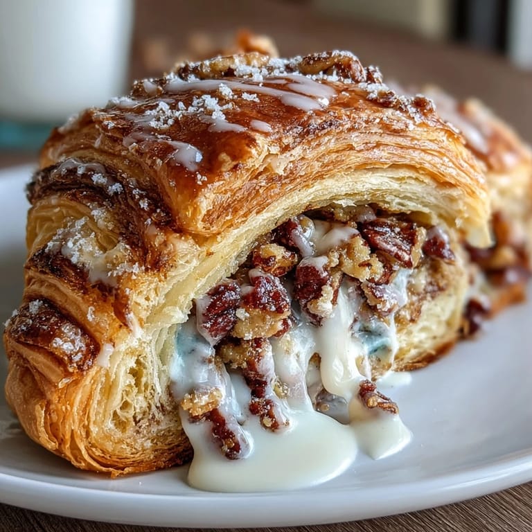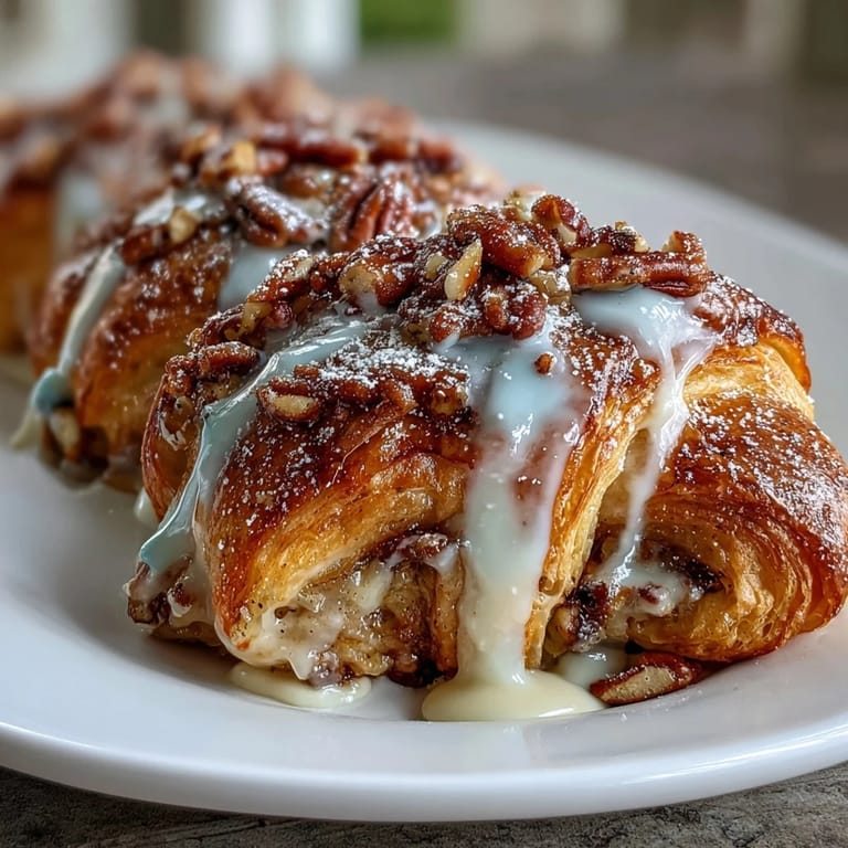 Flaky croissants stuffed with a spiced pecan filling and drizzled with festive icing sugars.