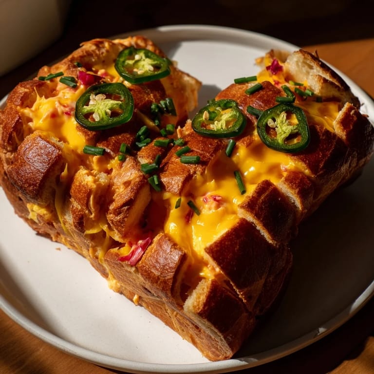 Save A fun, shareable twist on classic grilled cheese featuring creamy pimento cheese and spicy jalapeños baked into pull-apart bread—perfect for gatherings or game day.