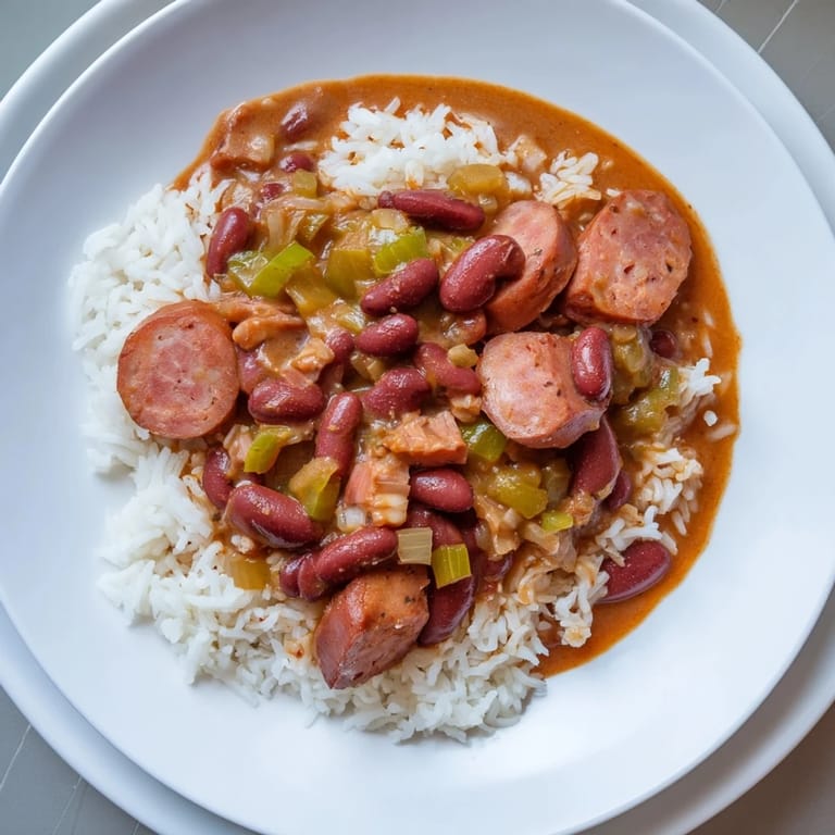 Save A classic Creole dish featuring tender red beans simmered with smoky sausage and aromatic vegetables, served over fluffy white rice. Hearty, flavorful, and perfect for a comforting meal.
