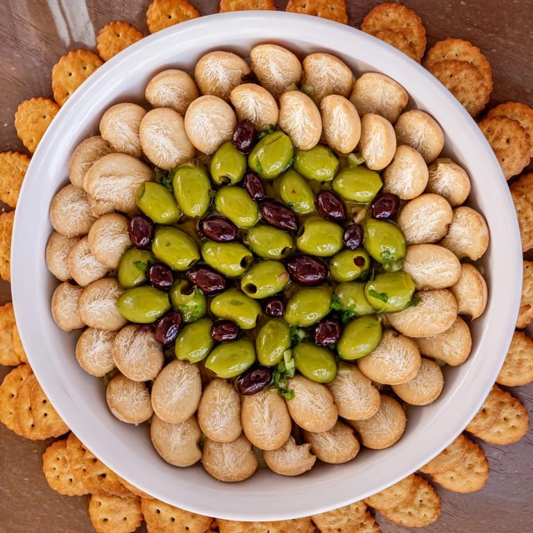 - Pile the mixed olives into the center mound, creating height and contrast with the crackers—this is where the drama lives, so don't be shy about building it tall.