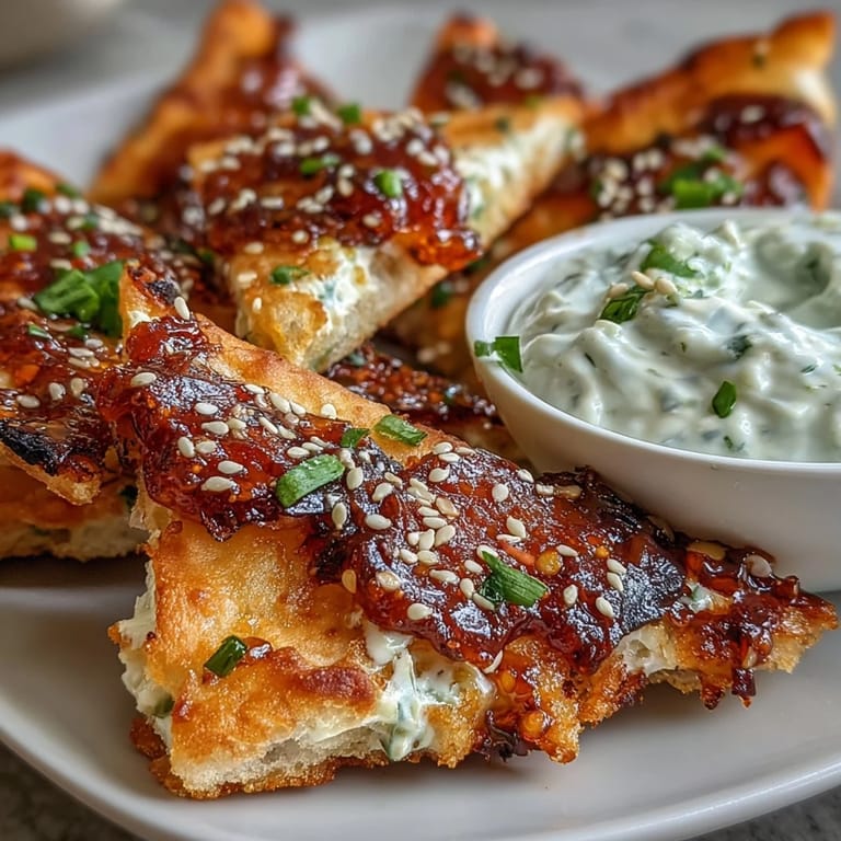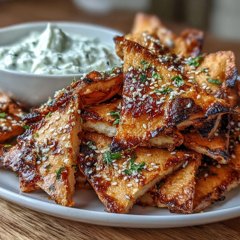 This flavorful snack features crispy garlic naan chips brushed with a spicy chili crisp coating, baked to golden perfection. Accompanying these chips is a creamy Asian-inspired cucumber dip, combining Greek yogurt, diced cucumber, soy sauce, sesame oil, and fresh herbs for a refreshing contrast. Together, they deliver a harmonious mix of heat, creaminess, and texture perfect for sharing as an appetizer or snack.